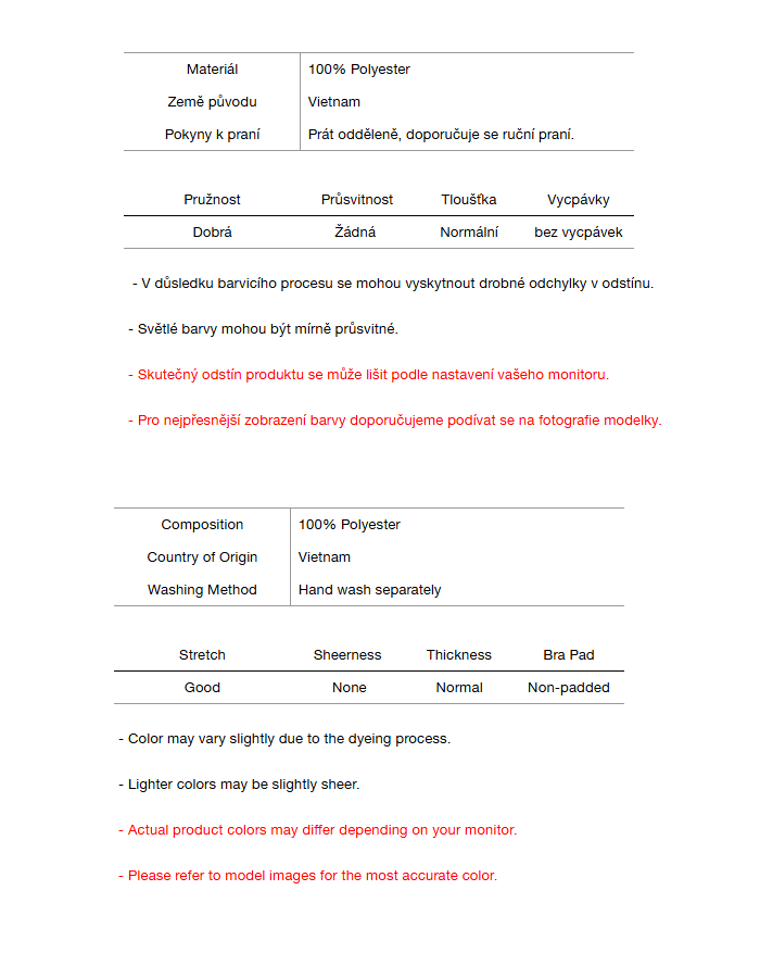 • Tmavé oděvy mohou prosakovat – před nošením perte odděleně.